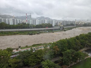 [포토뉴스] 8월 13일 전국에 비가 내리면서 단시간의 집중호우로 인해 서울 노원구 주변 당현천의 다리 위까지 빗물이 올라오고 있다.
