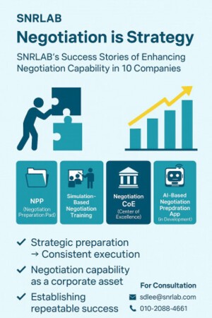 복잡한 이해관계와 빠르게 변화하는 글로벌 시장에서 ‘협상력’은 더 이상 특정 직무군의 개인 기술이 아닌, 조직이 통합적으로 관리하고 시스템화해야 할 핵심 전략 역량이 됐다. 이에 전략적 협상 컨설팅 전문기관 SNRLAB (전략적협상연구소)는 실제 산업 현장에서 검증된 10개의 협상 역량 강화 성공 사례를 바탕으로 ‘협상 역량 개선 성공 사례집 2025’를 발간했다고 밝혔다.이 사례집은 단순히 협상 테크닉을 다루는 자료가 아니다. 이성대 소장을 중심으로 수년간 진행된 다양한 기업 대상의 교육·자문 프로젝트의 성과를 토대로, 협상력을