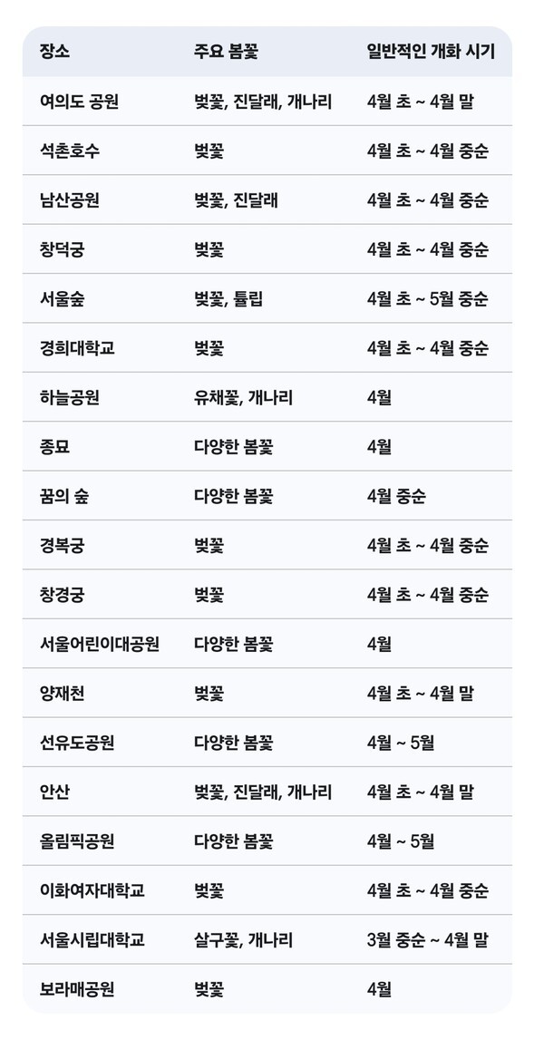 서울의 벚꽃은 일반적으로 4월 초에서 중순 사이에 만개하며, 개나리와 진달래는 3월 중순부터 4월 말까지 감상할 수 있습니다. 매년 날씨에 따라 개화 시기가 달라질 수 있으므로, 방문 전에 개화 예보를 확인하는 것이 좋습니다. 이외에도 목련, 살구꽃, 철쭉, 튤립, 유채꽃 등 다양한 봄꽃들이 3월부터 5월까지 서울 곳곳에서 아름다운 자태를 뽐냅니다.