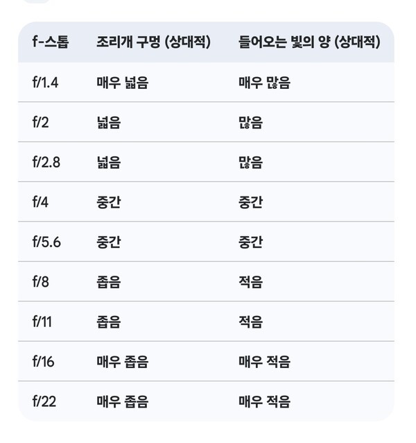 조리개는 단순히 빛의 양을 조절하는 것 외에도 사진의 ‘심도’(초점이 맞는 영역의 깊이)에 큰 영향을 미칩니다. 얕은 심도는 피사체에만 초점이 맞고 배경은 흐릿하게 처리되는 효과를 나타내며, 인물 사진에서 피사체를 강조할 때 자주 사용됩니다. 반대로 깊은 심도는 사진 전체에 초점이 선명하게 맞춰지는 효과로, 풍경 사진처럼 모든 요소를 선명하게 담고 싶을 때 유용합니다.